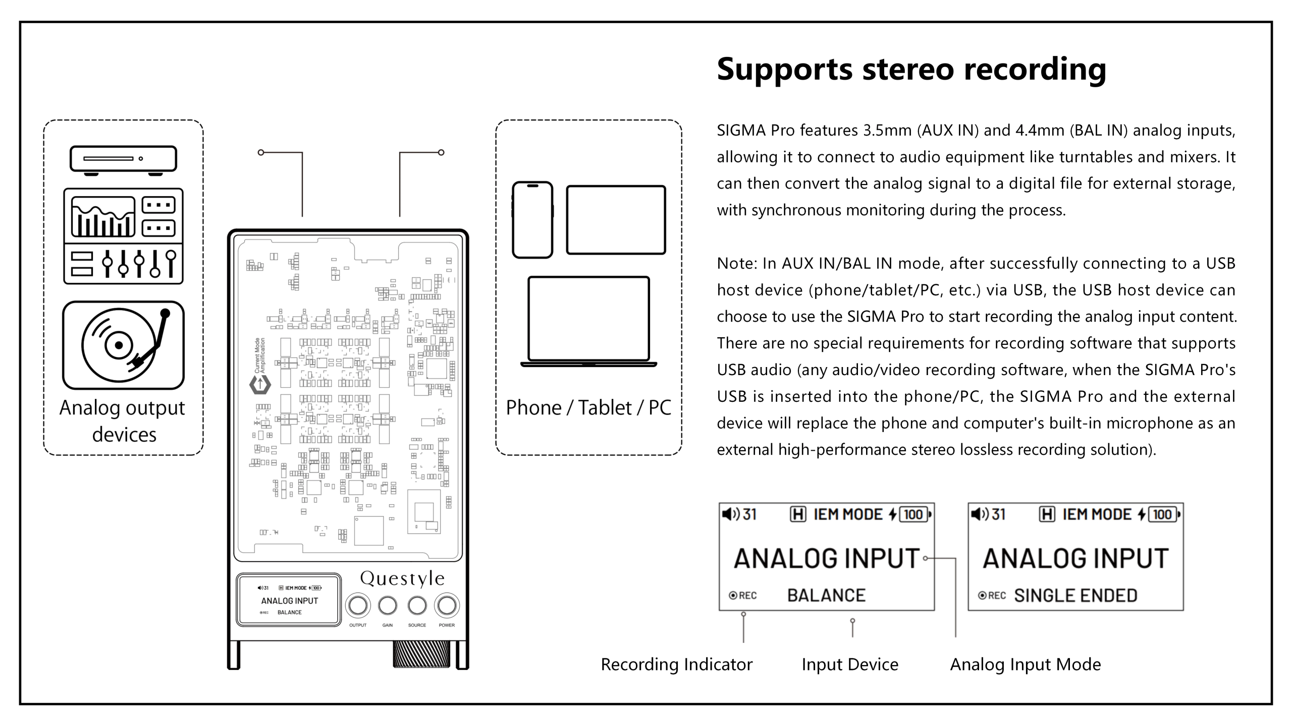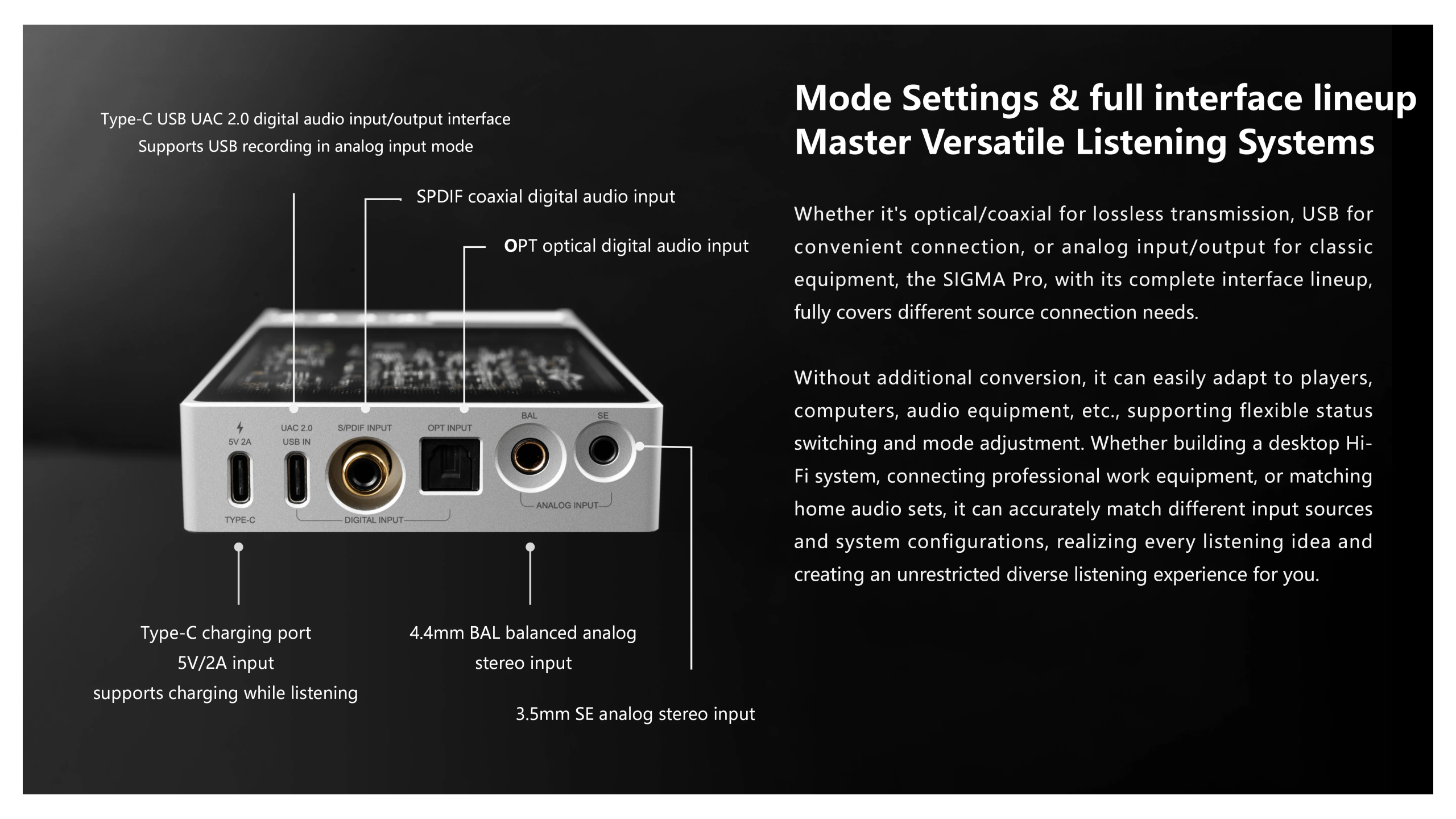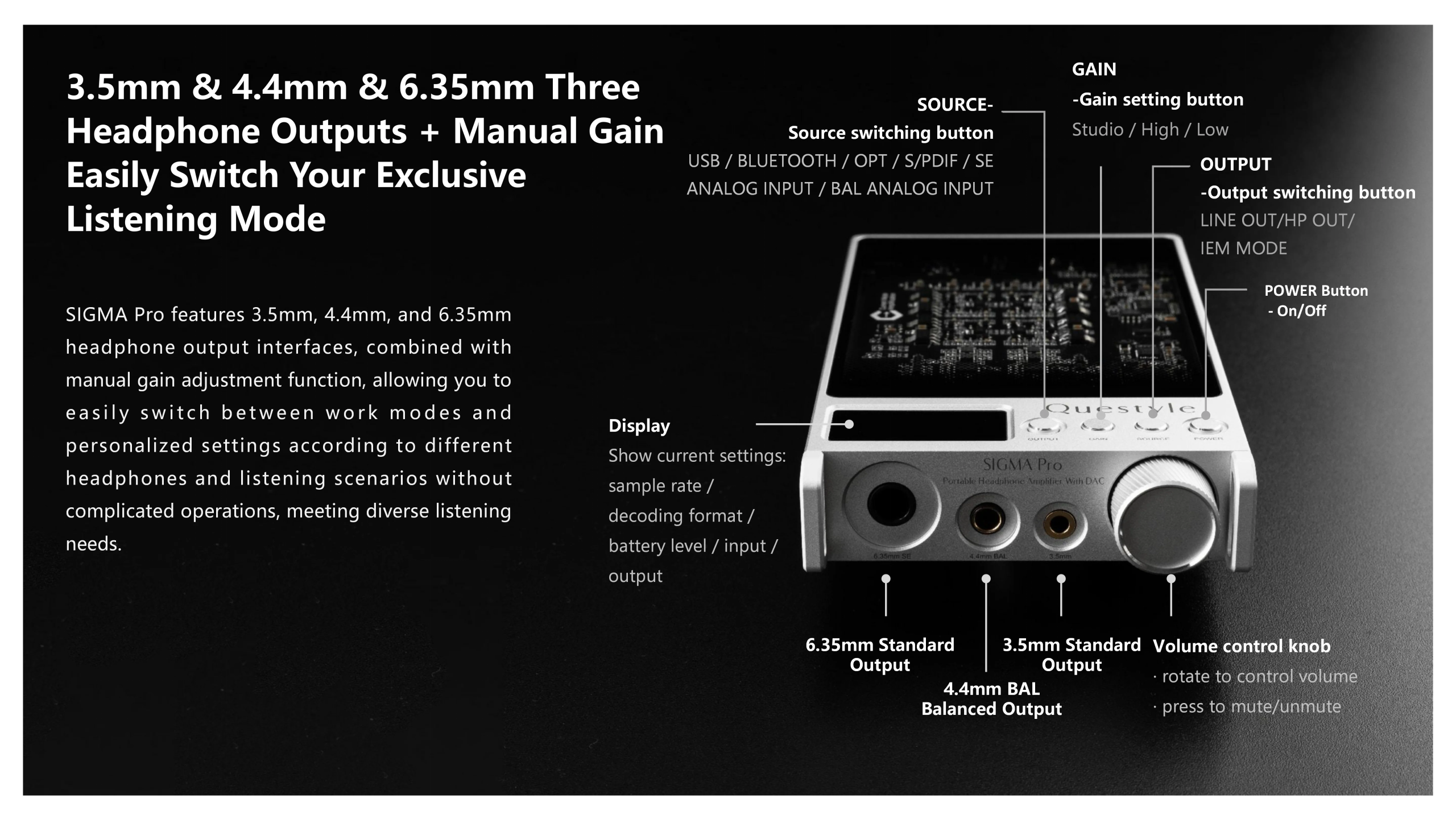 •  3.5mm, 4.4mm, & 6.35mm headphone output jacks