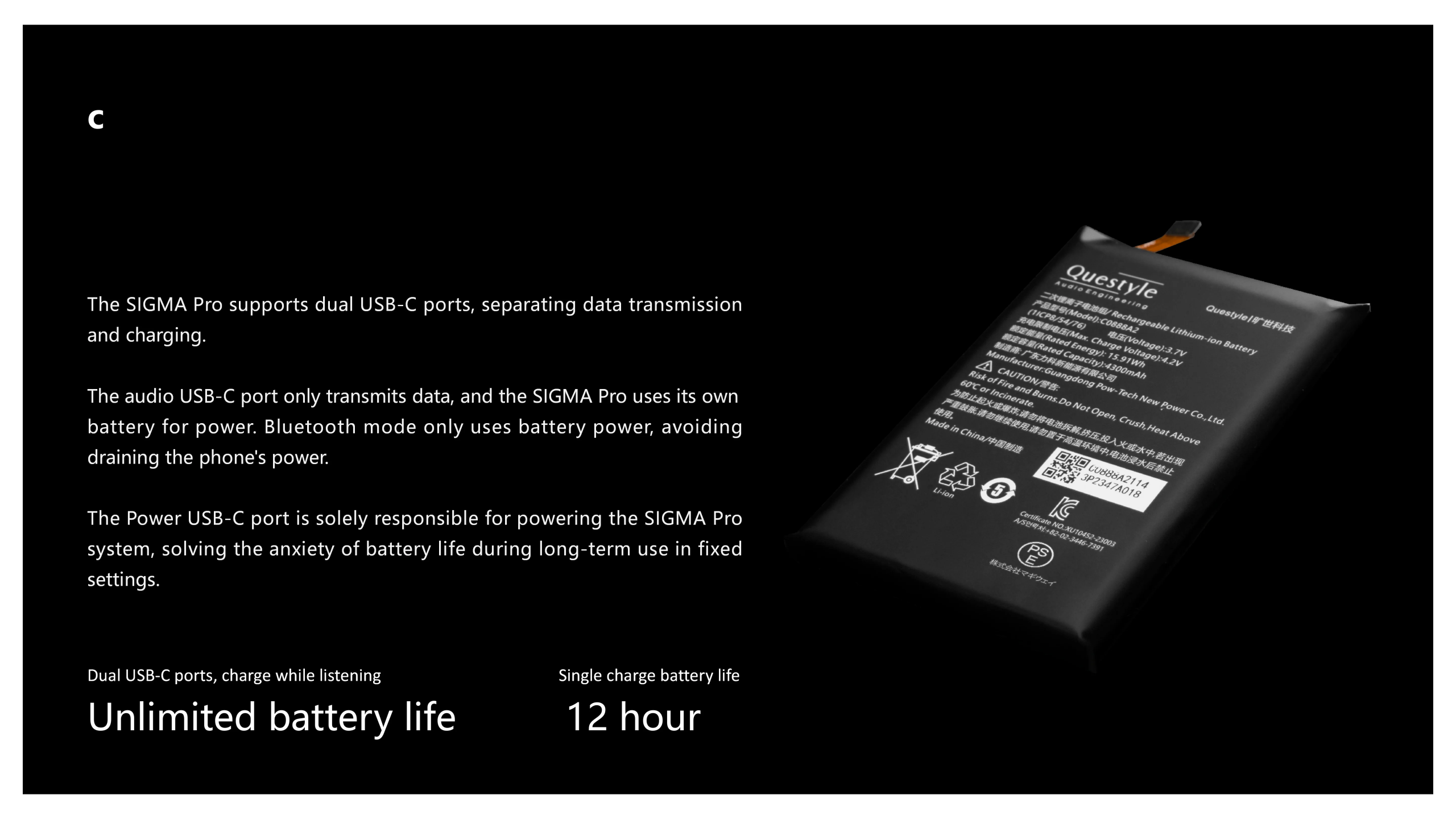• Dual USB-C port design supports charging while listening, eliminating battery anxiety.