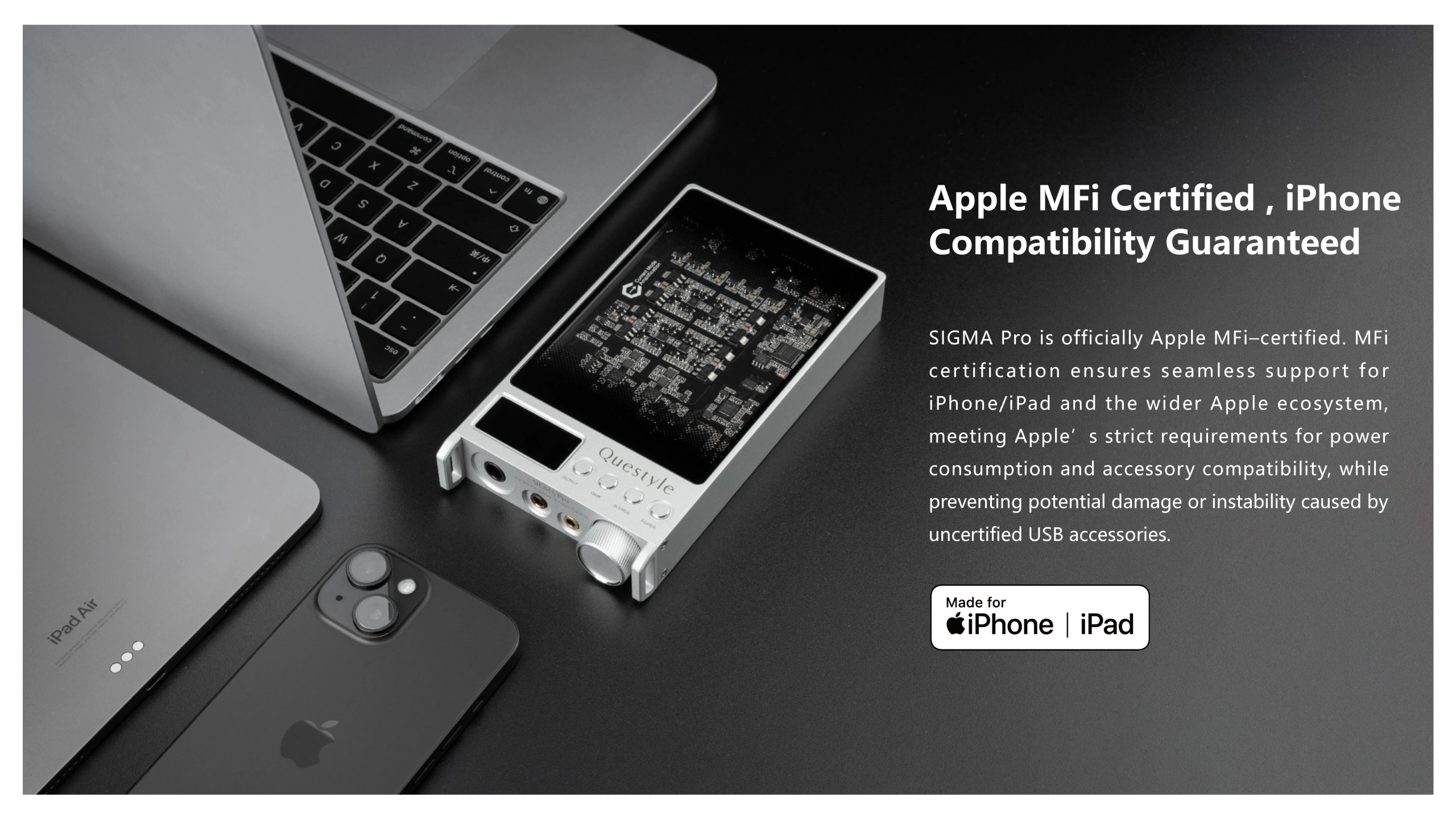 • Apple MFi certified, seamless integration within the Apple ecosystem.